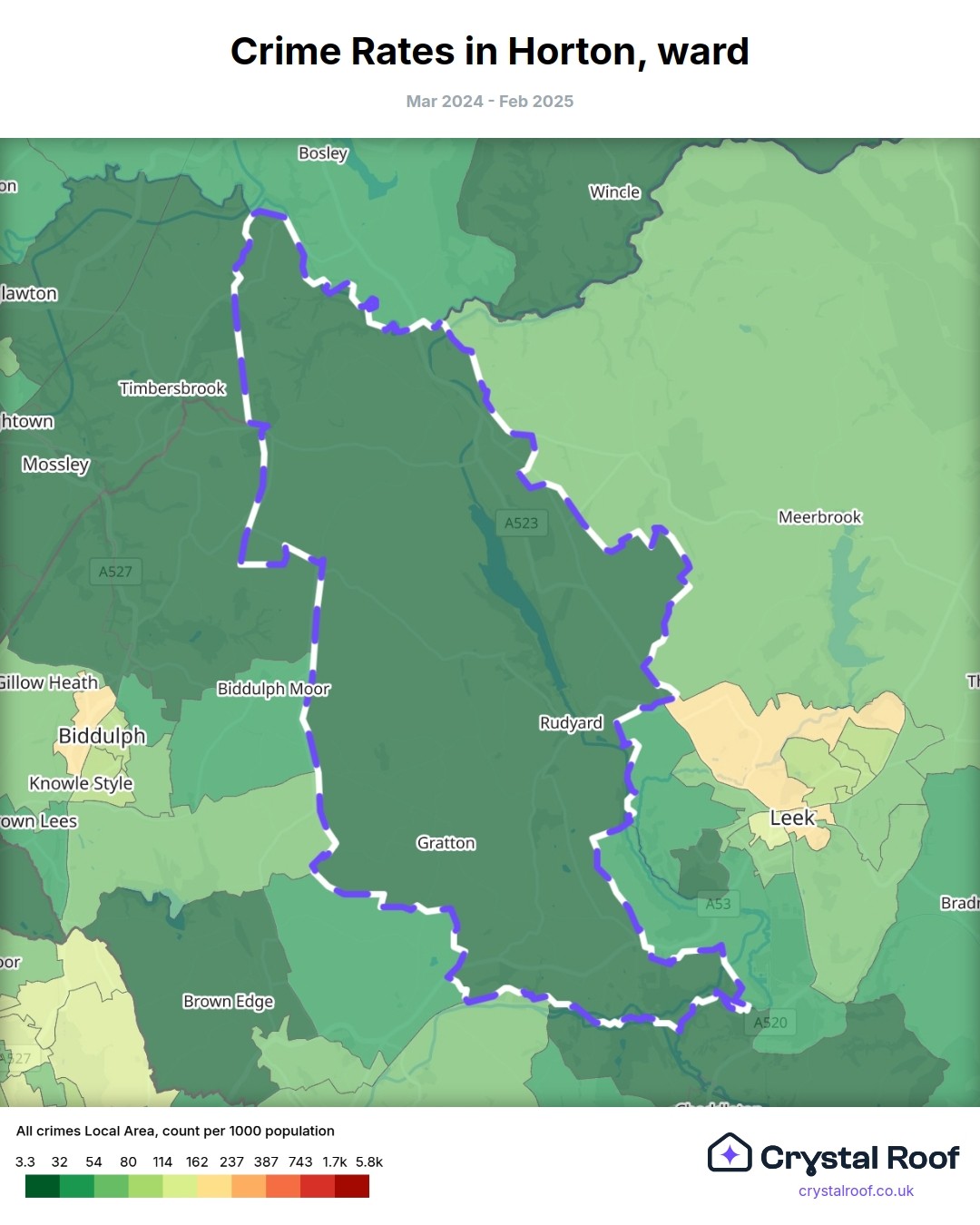 Horton (ward) is located within Staffordshire Moorlands (borough). Annual total crime rate in Staffordshire Moorlands (borough) is 67.1 crimes per thousand resident population, which can be rated as 2 out of 10 or low crime level compared to other local authority districts in England and Wales.