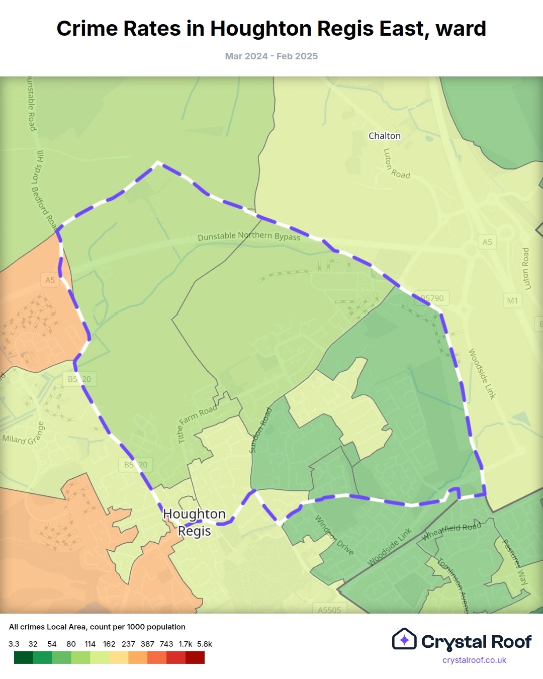 Houghton Regis East, (ward) includes areas with the following crime ratings (see map):