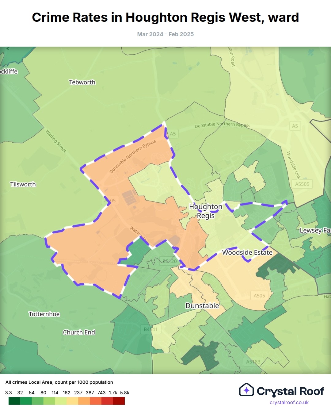 The figures in grey indicate the relative ratings of Houghton Regis West (ward) for a specific crime type compared to other wards in England and Wales.