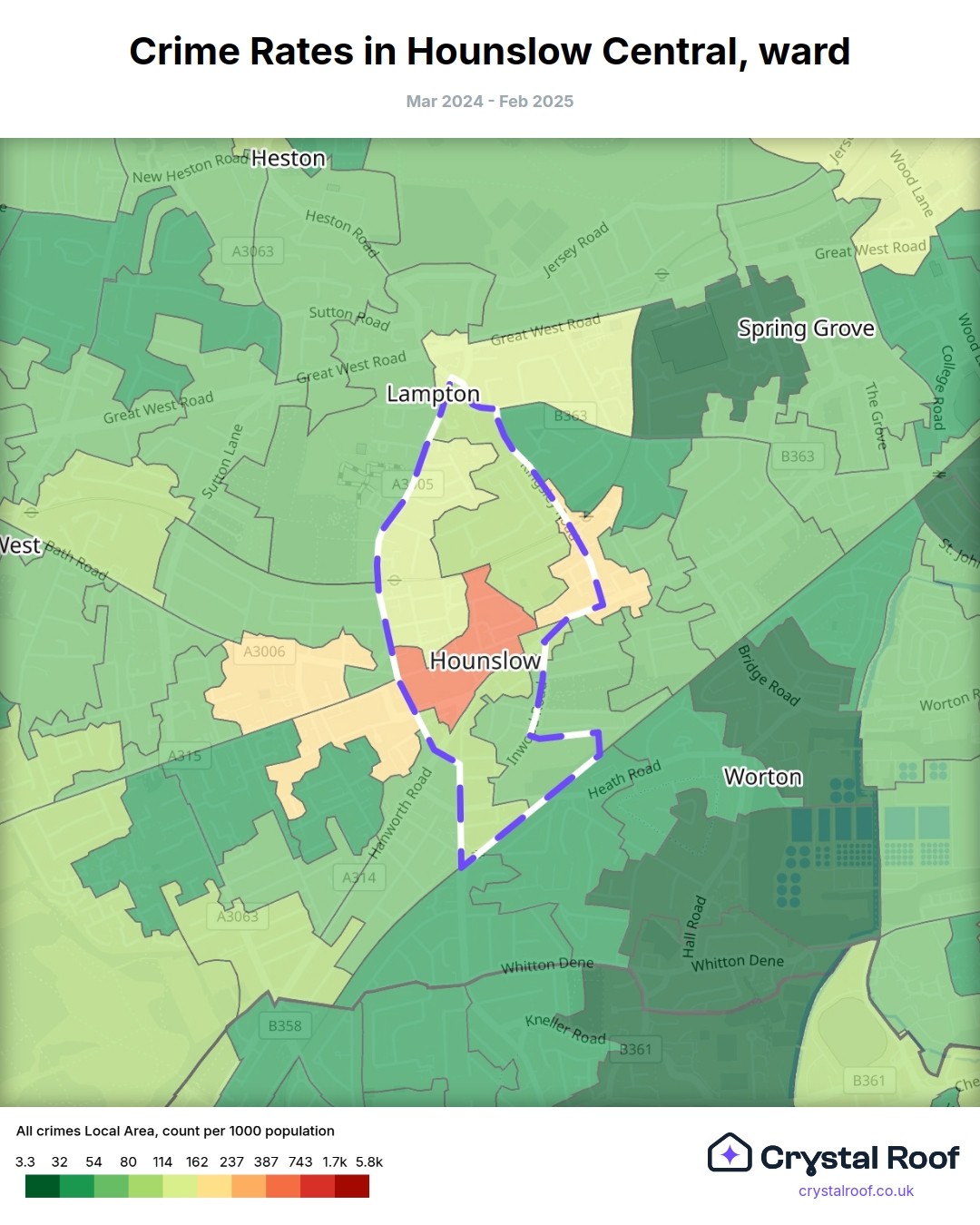 Hounslow Central, (ward) includes areas with the following crime ratings (see map):