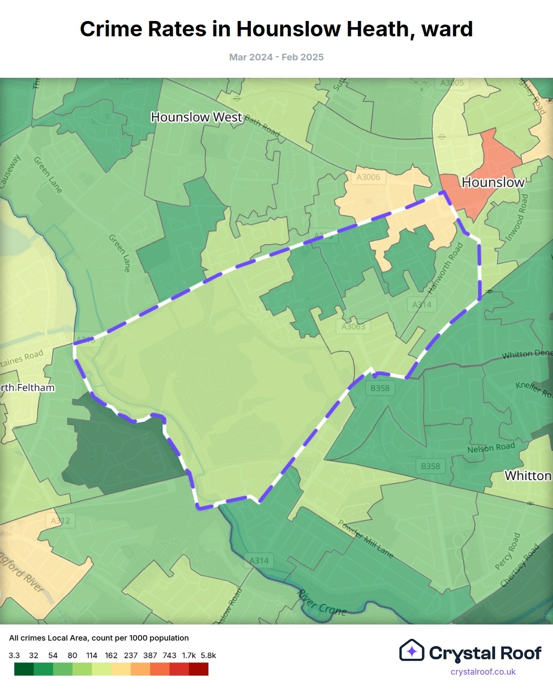 Hounslow Heath, (ward) includes areas with the following crime ratings (see map):