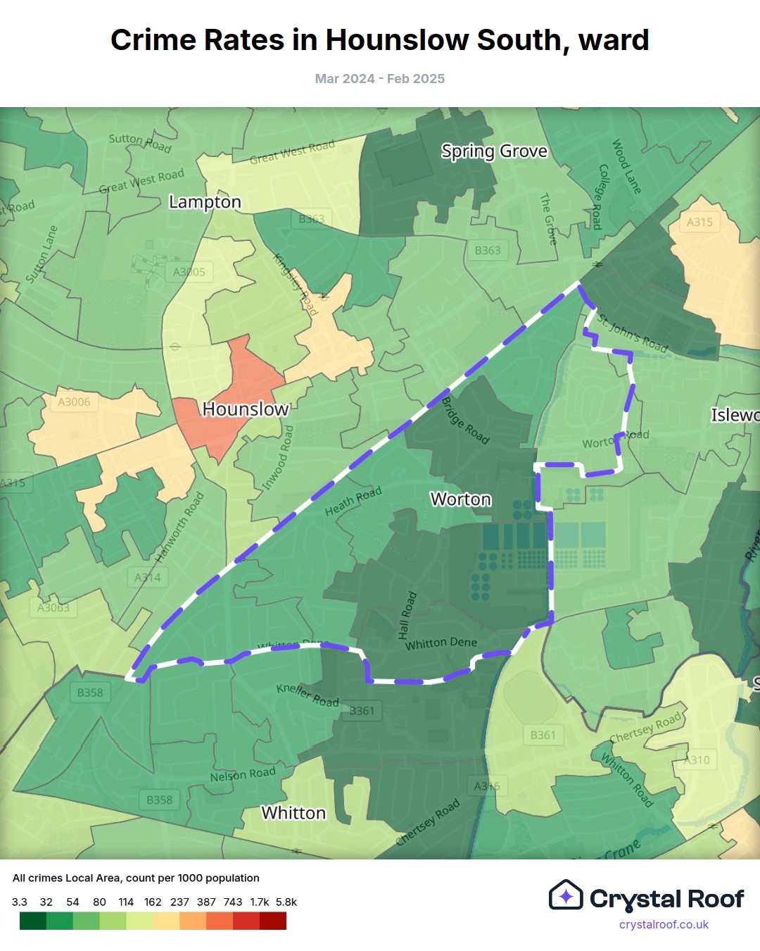 Hounslow South, (ward) includes areas with the following crime ratings (see map):