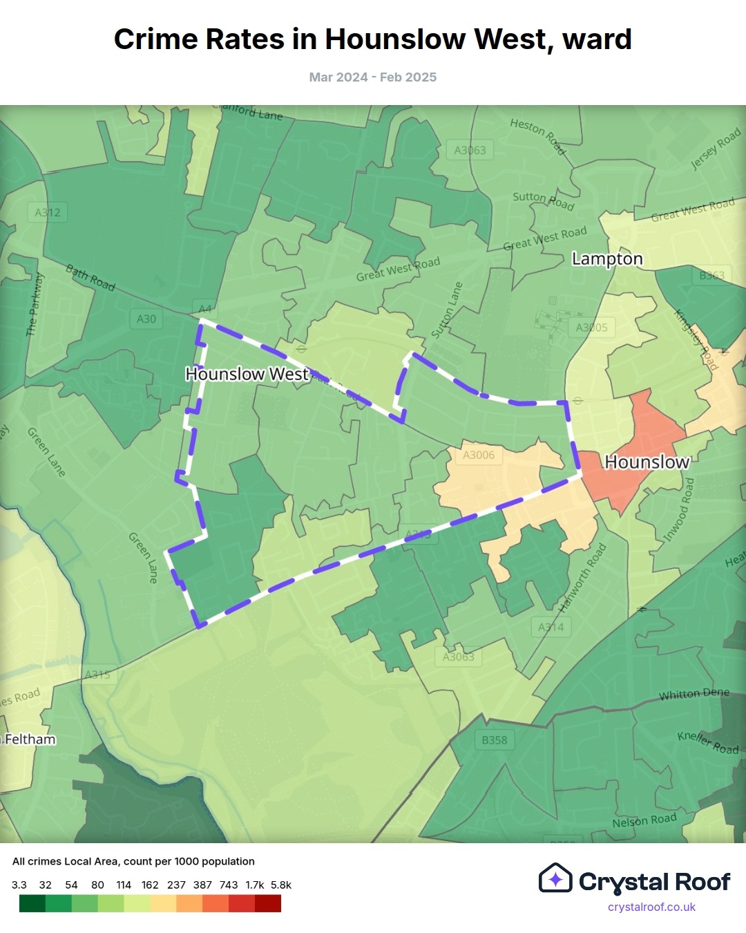 Hounslow West, (ward) includes areas with the following crime ratings (see map):