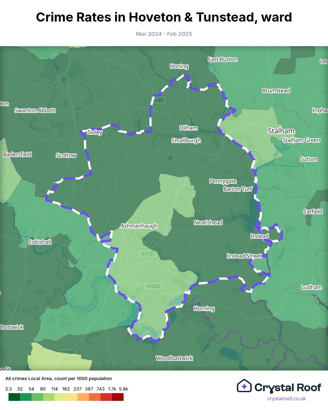 Hoveton & Tunstead, (ward) includes areas with the following crime ratings (see map):