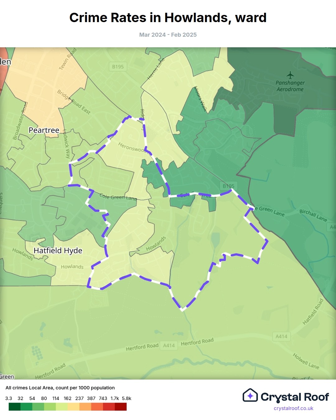 Howlands (ward) is located within Welwyn Hatfield (borough). Annual total crime rate in Welwyn Hatfield (borough) is 103 crimes per thousand resident population, which can be rated as 5 out of 10 or medium crime level compared to other local authority districts in England and Wales.