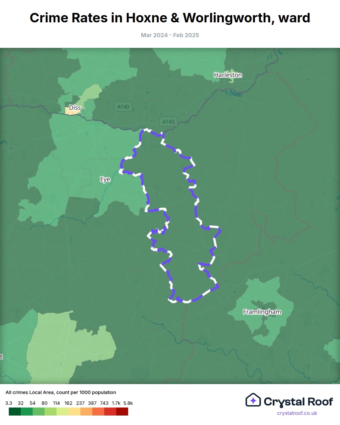Hoxne & Worlingworth, (ward) includes areas with the following crime ratings (see map):