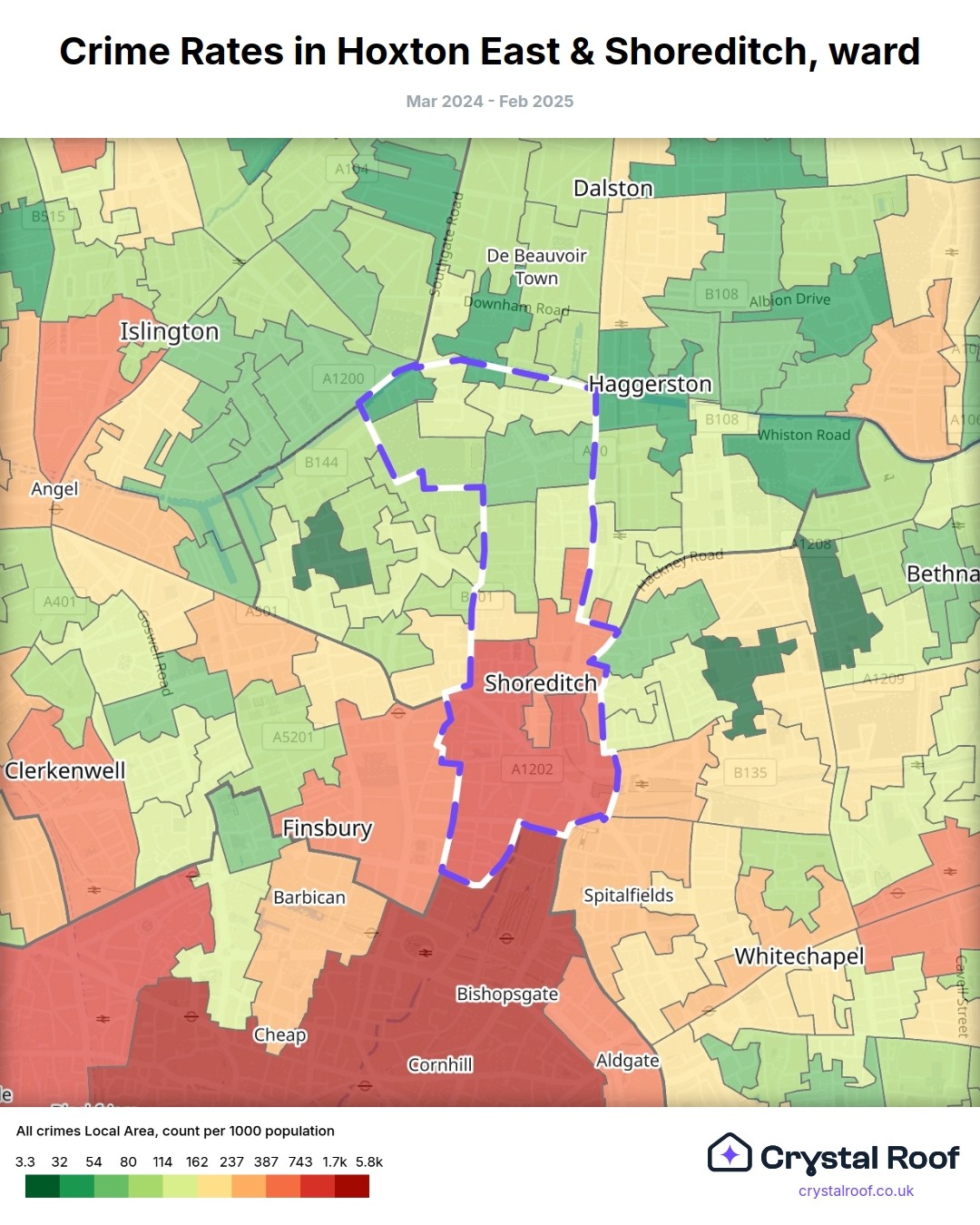 Hoxton East & Shoreditch, (ward) includes areas with the following crime ratings (see map):