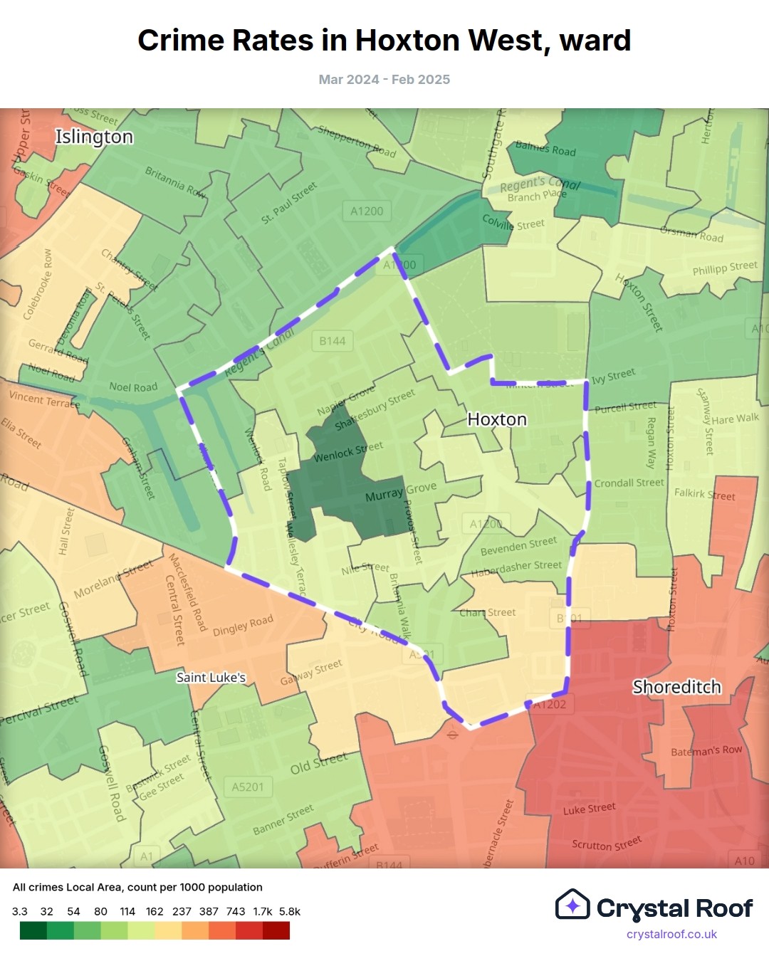 Hoxton West, (ward) includes areas with the following crime ratings (see map):