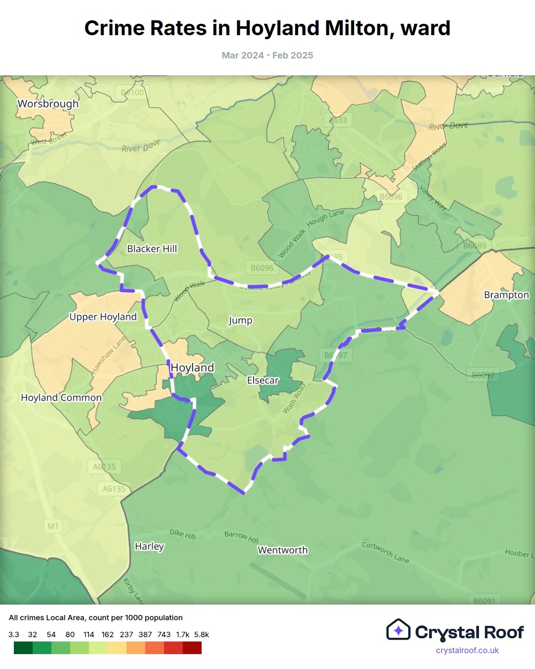 Hoyland Milton, (ward) includes areas with the following crime ratings (see map):