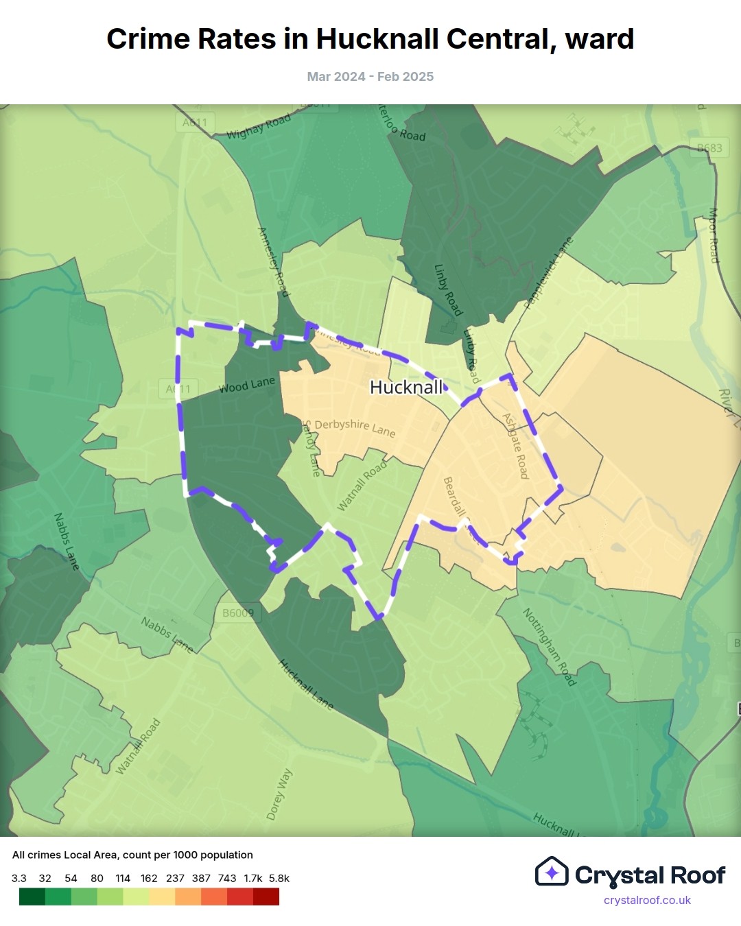 Hucknall Central, (ward) includes areas with the following crime ratings (see map):