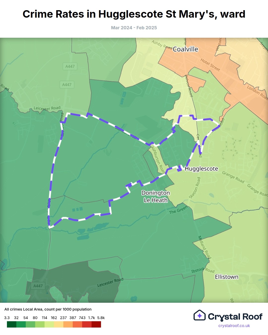 The figures in grey indicate the relative ratings of Hugglescote St Mary's (ward) for a specific crime type compared to other wards in England and Wales.