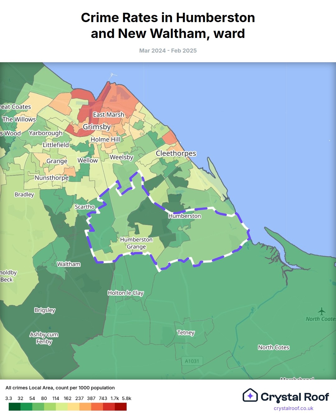 Humberston and New Waltham, (ward) includes areas with the following crime ratings (see map):