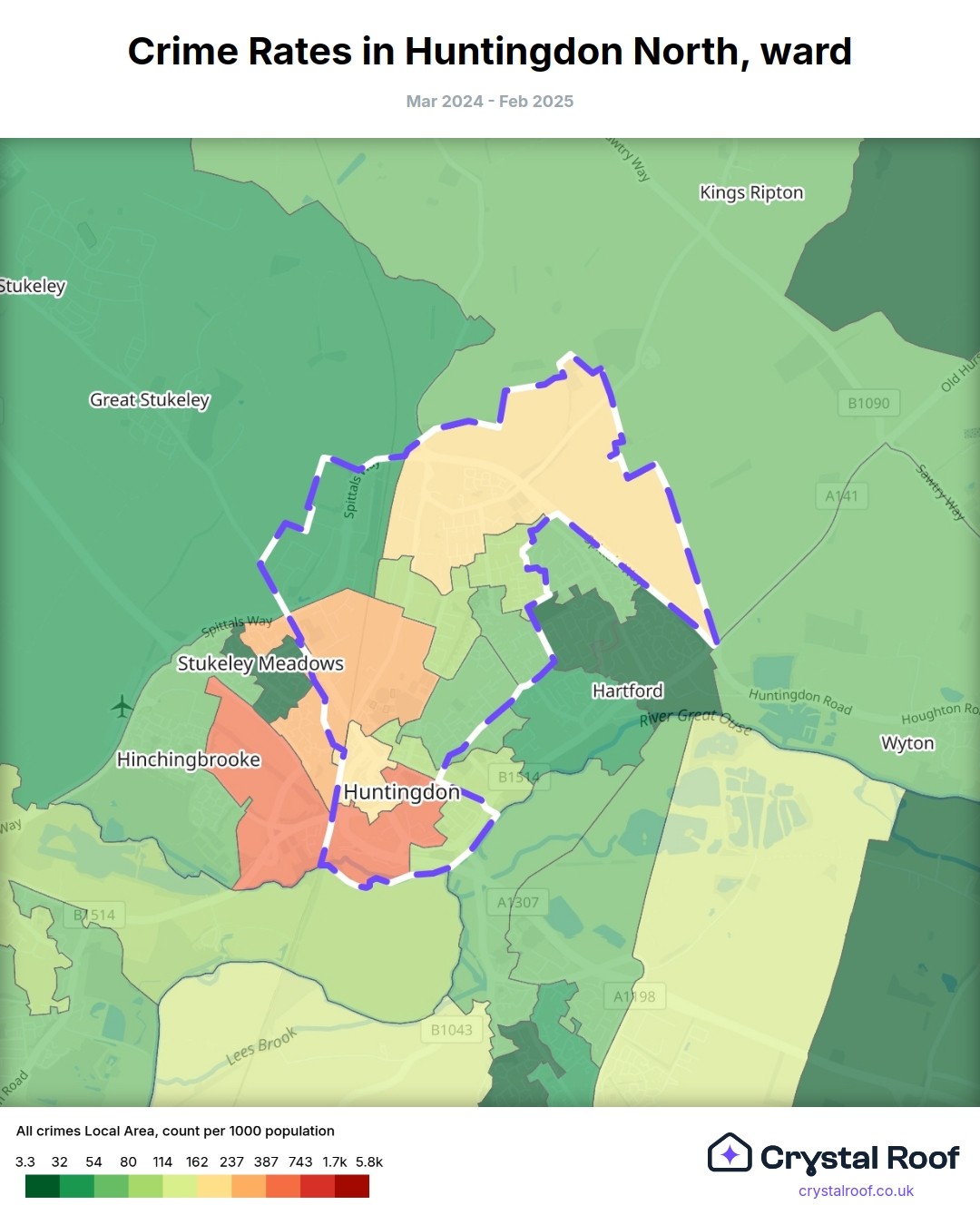 Huntingdon North, (ward) includes areas with the following crime ratings (see map):