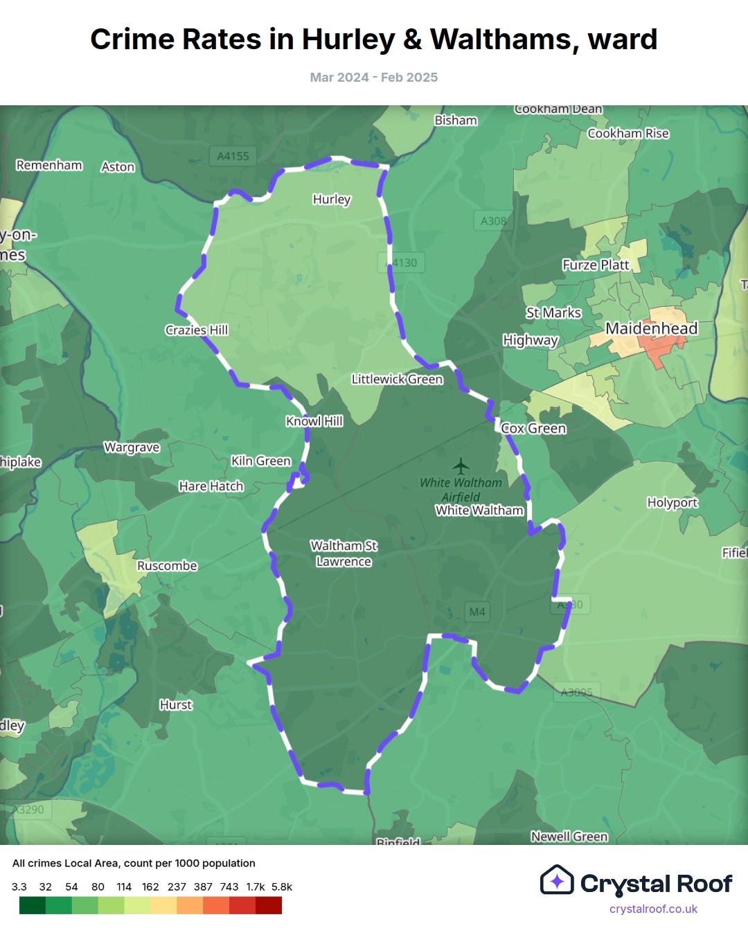 Hurley & Walthams (ward) is located within Windsor and Maidenhead (borough). Annual total crime rate in Windsor and Maidenhead (borough) is 69.4 crimes per thousand resident population, which can be rated as 2 out of 10 or low crime level compared to other local authority districts in England and Wales.
