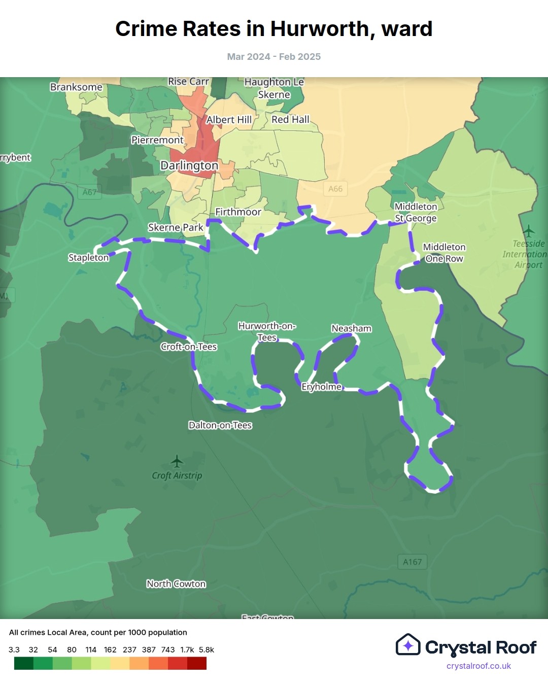 Hurworth, (ward) includes areas with the following crime ratings (see map):