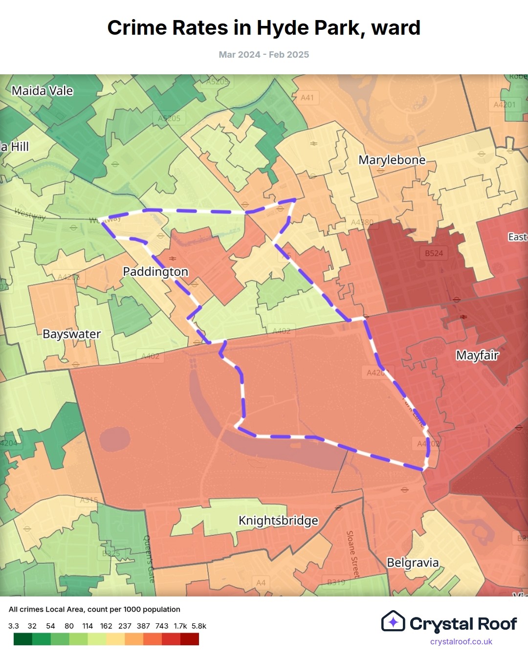 Hyde Park (ward) is located within Westminster (borough). Annual total crime rate in Westminster (borough) is 498 crimes per thousand resident population, which can be rated as 9 out of 10 or high crime level compared to other local authority districts in England and Wales.