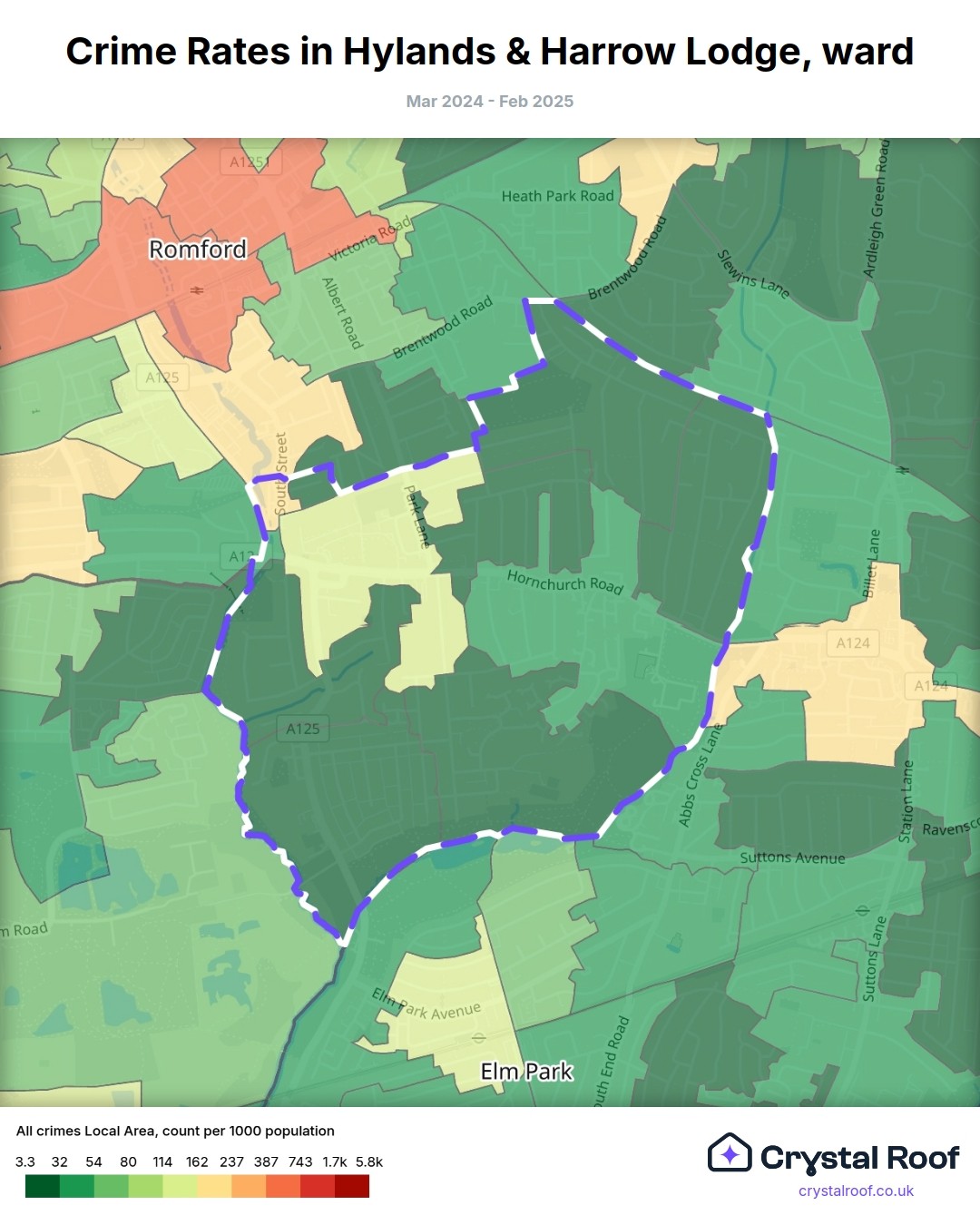 Hylands & Harrow Lodge, (ward) includes areas with the following crime ratings (see map):