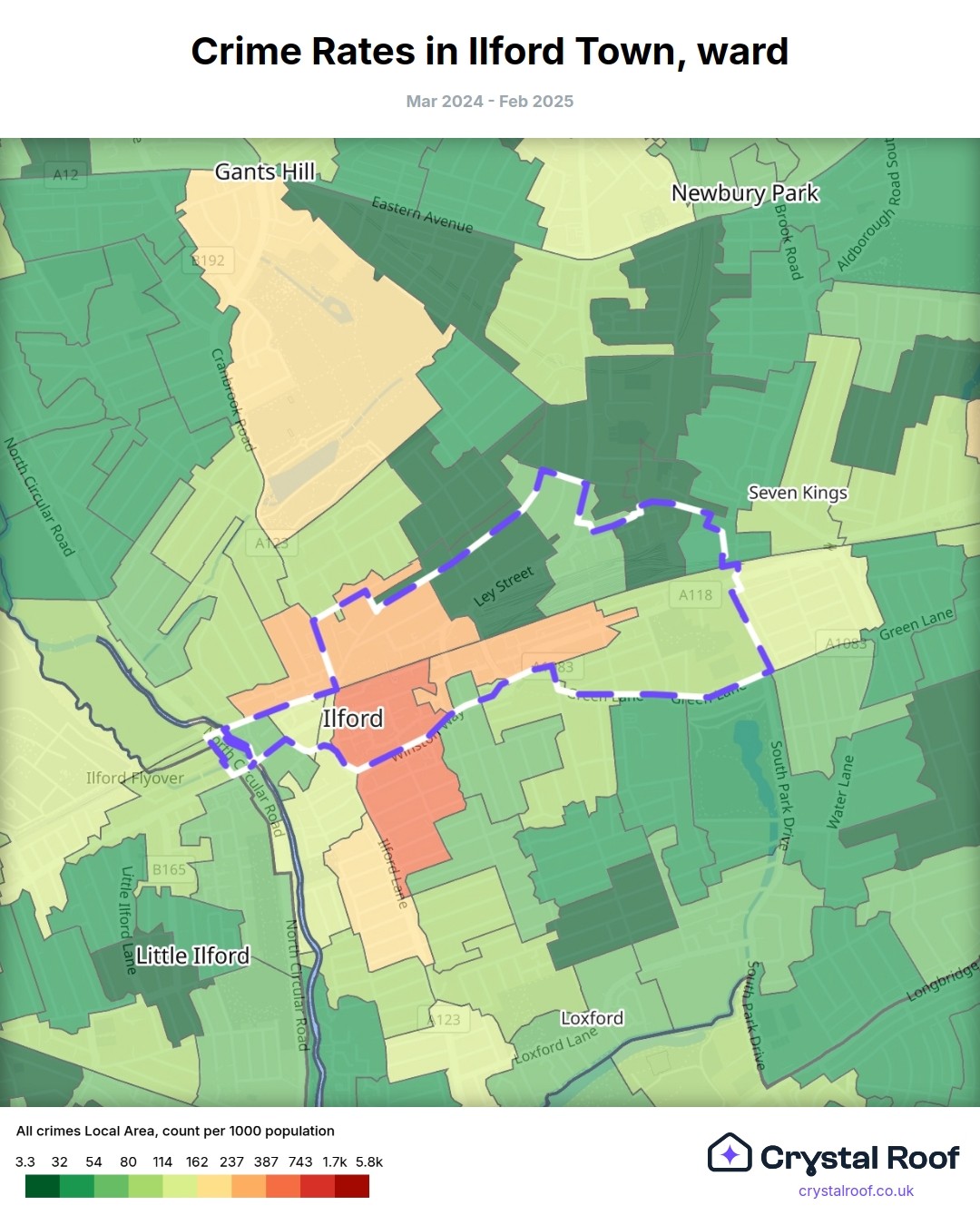 The figures in grey indicate the relative ratings of Ilford Town (ward) for a specific crime type compared to other wards in England and Wales.