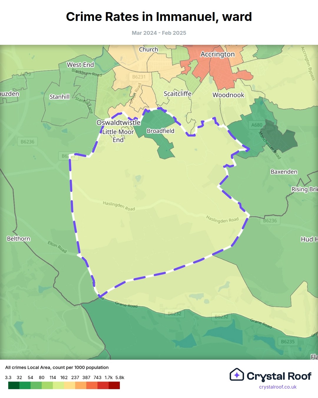 Immanuel (ward) is located within Hyndburn (borough). Annual total crime rate in Hyndburn (borough) is 141 crimes per thousand resident population, which can be rated as 7 out of 10 or high crime level compared to other local authority districts in England and Wales.
