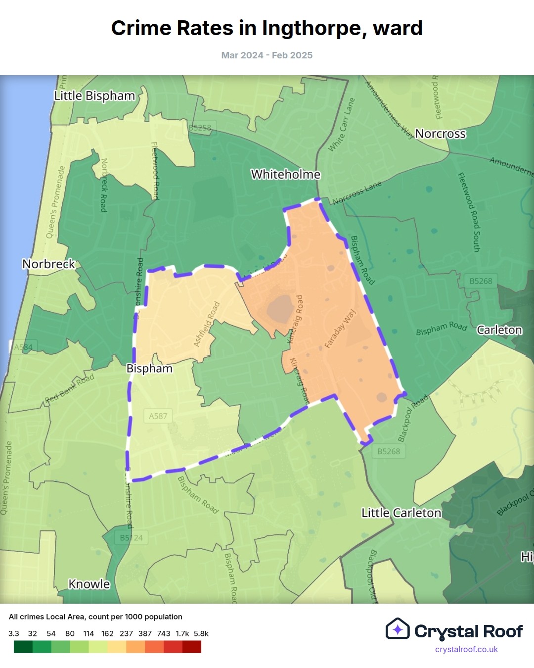 Ingthorpe (ward) is located within Blackpool (borough). Annual total crime rate in Blackpool (borough) is 216 crimes per thousand resident population, which can be rated as 8 out of 10 or high crime level compared to other local authority districts in England and Wales.