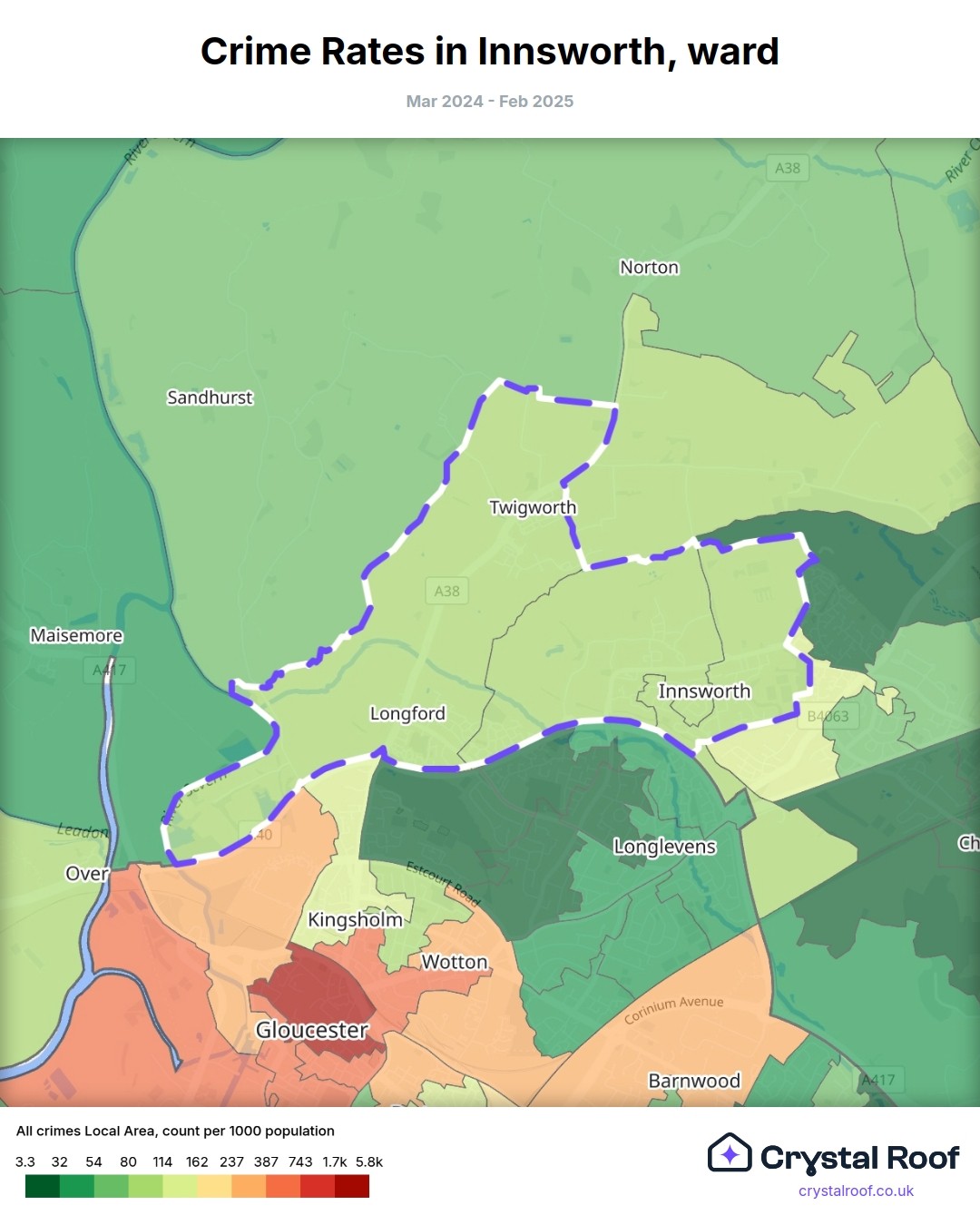 The figures in grey indicate the relative ratings of Innsworth (ward) for a specific crime type compared to other wards in England and Wales.