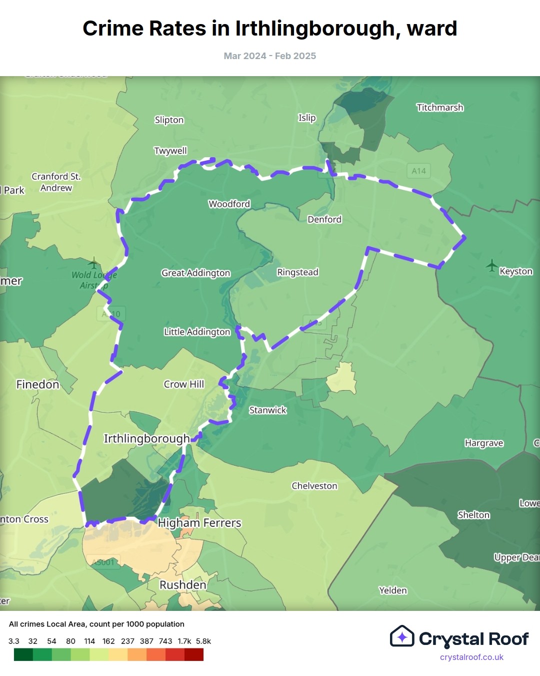 Irthlingborough, (ward) includes areas with the following crime ratings (see map):