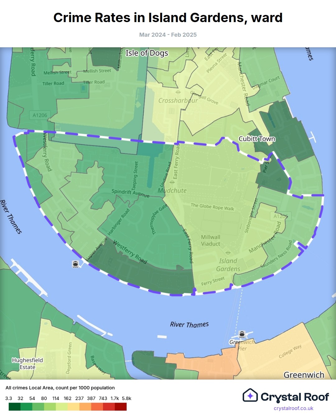 Island Gardens, (ward) includes areas with the following crime ratings (see map):