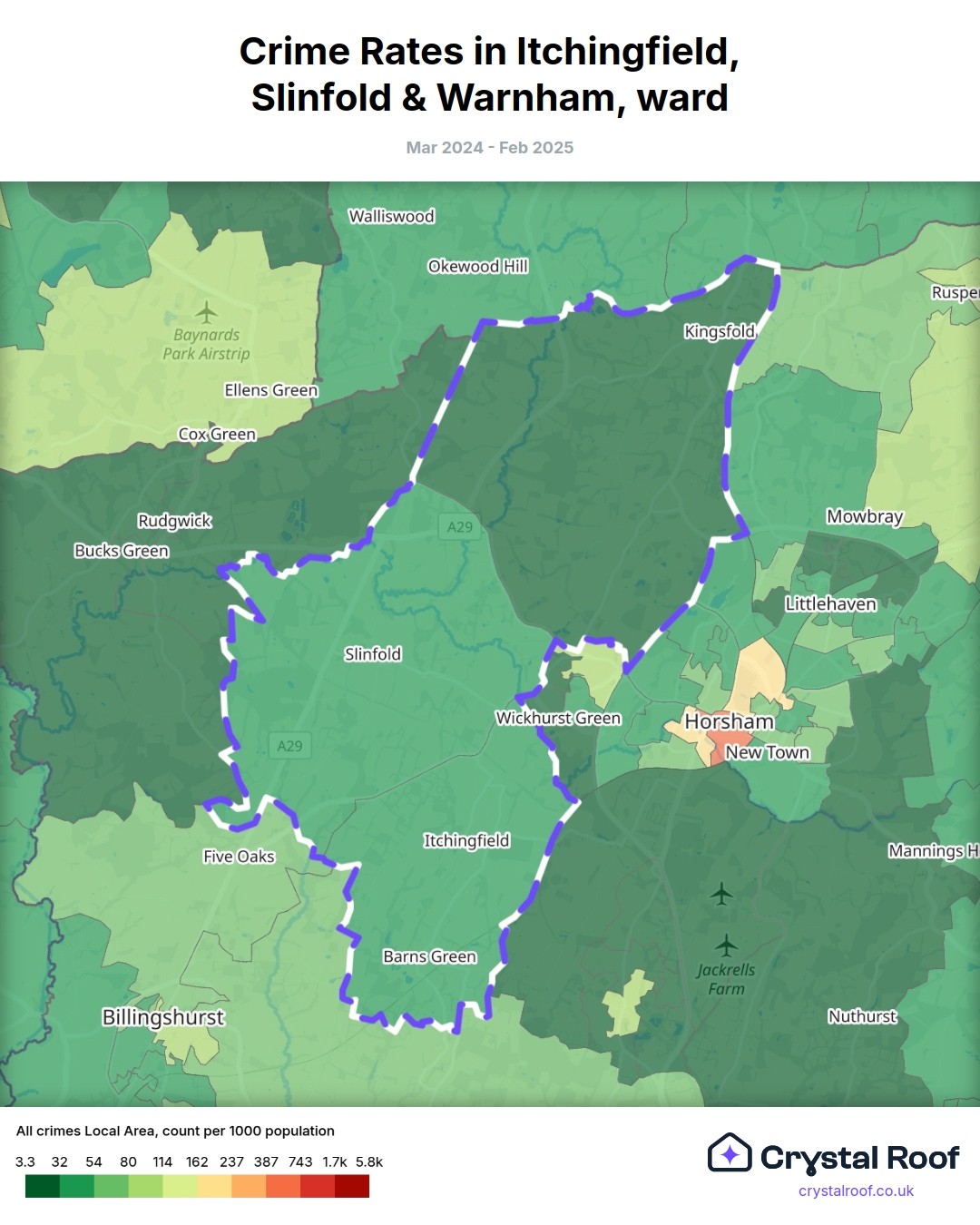 Itchingfield, Slinfold & Warnham, (ward) includes areas with the following crime ratings (see map):