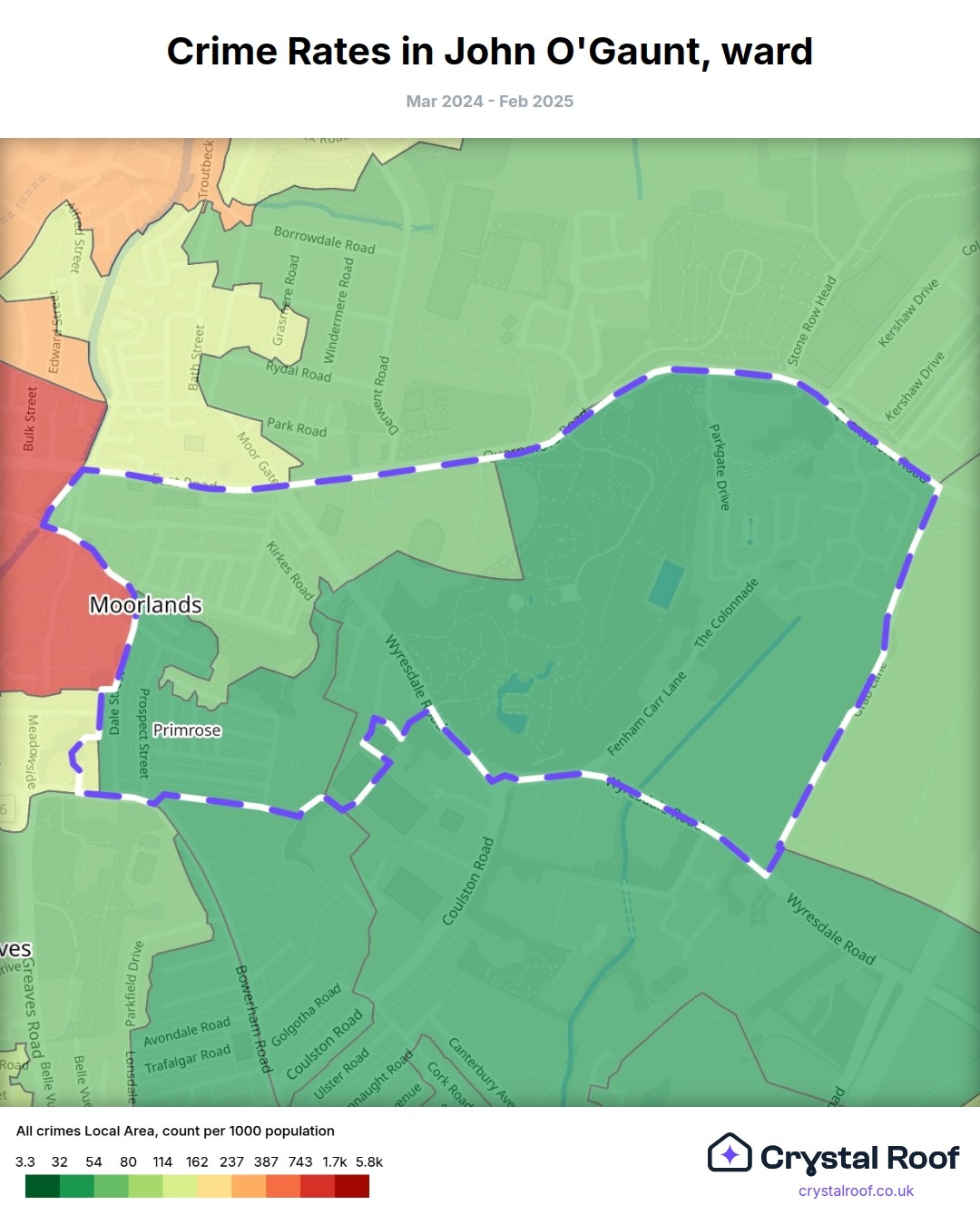 John O'Gaunt, (ward) includes areas with the following crime ratings (see map):