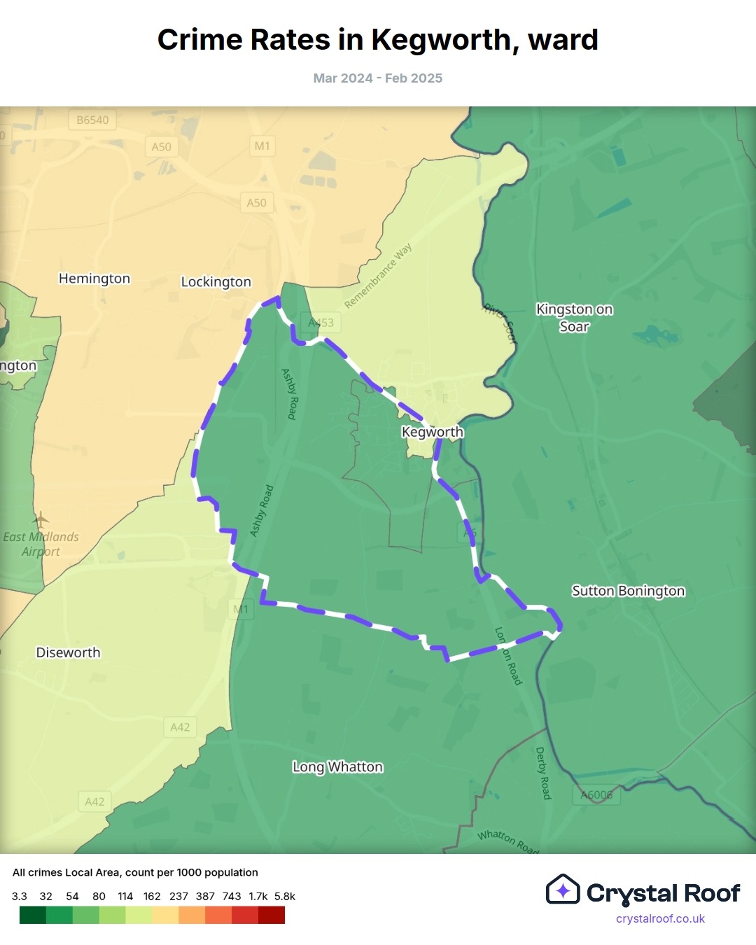 The figures in grey indicate the relative ratings of Kegworth (ward) for a specific crime type compared to other wards in England and Wales.
