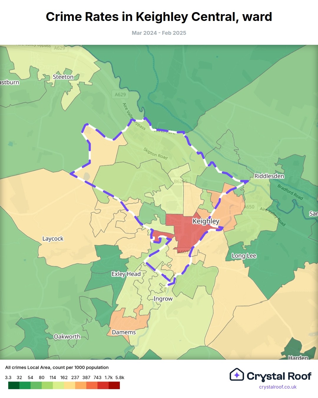 Keighley Central, (ward) includes areas with the following crime ratings (see map):