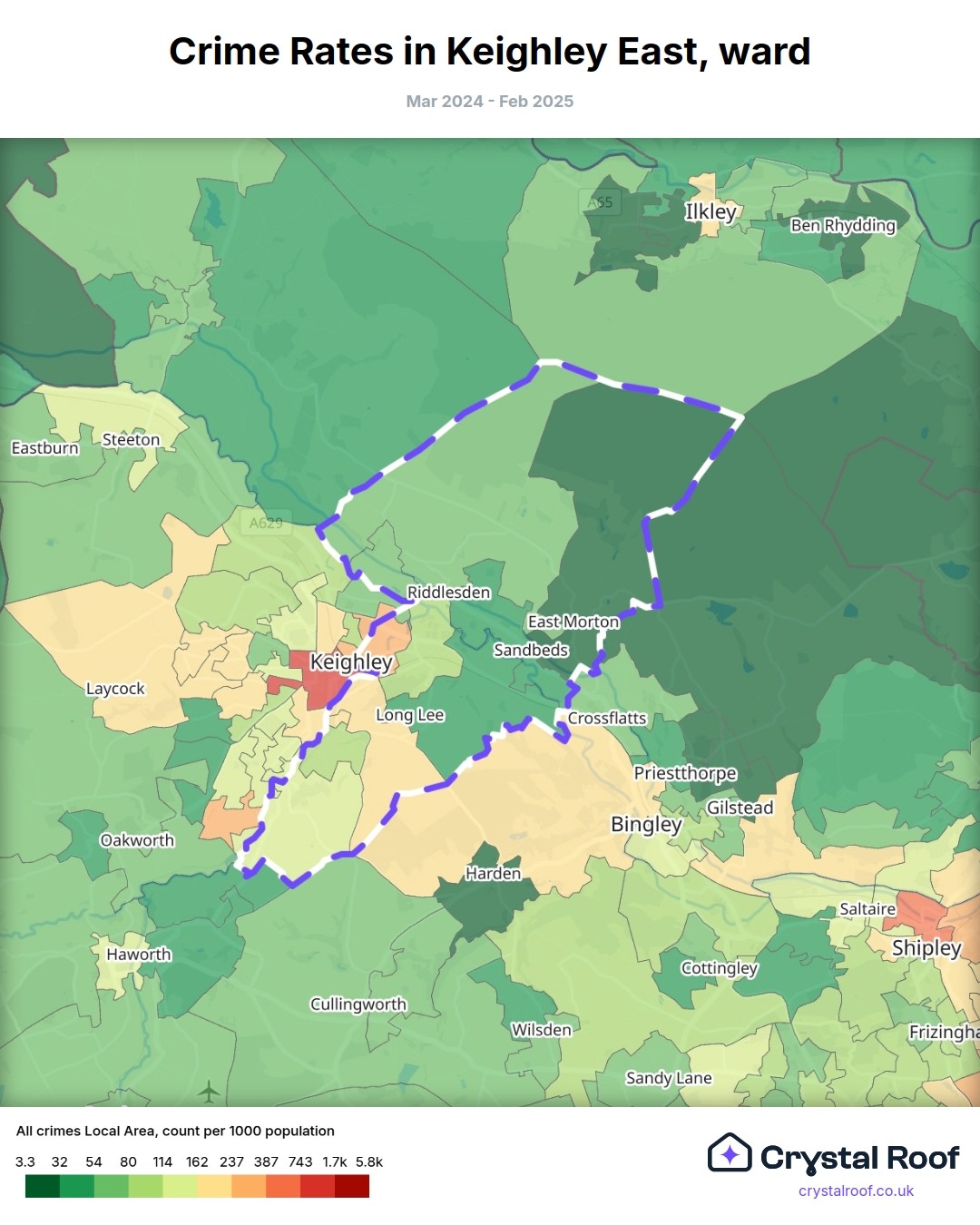 The figures in grey indicate the relative ratings of Keighley East (ward) for a specific crime type compared to other wards in England and Wales.