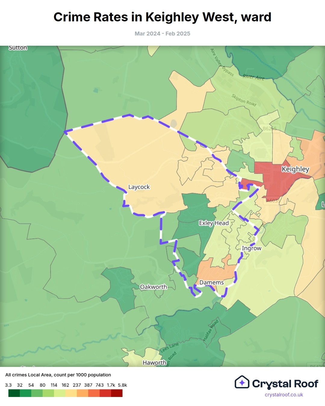 The figures in grey indicate the relative ratings of Keighley West (ward) for a specific crime type compared to other wards in England and Wales.