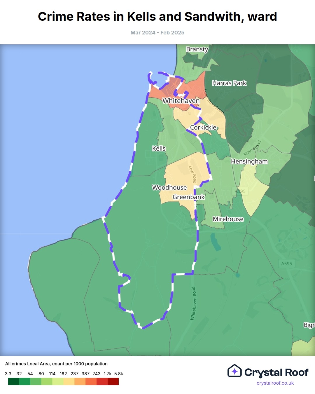 Kells and Sandwith, (ward) includes areas with the following crime ratings (see map):