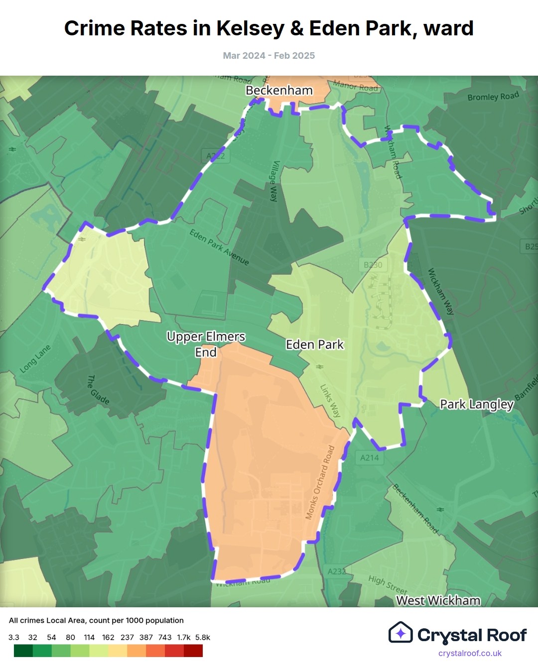 The figures in grey indicate the relative ratings of Kelsey & Eden Park (ward) for a specific crime type compared to other wards in England and Wales.