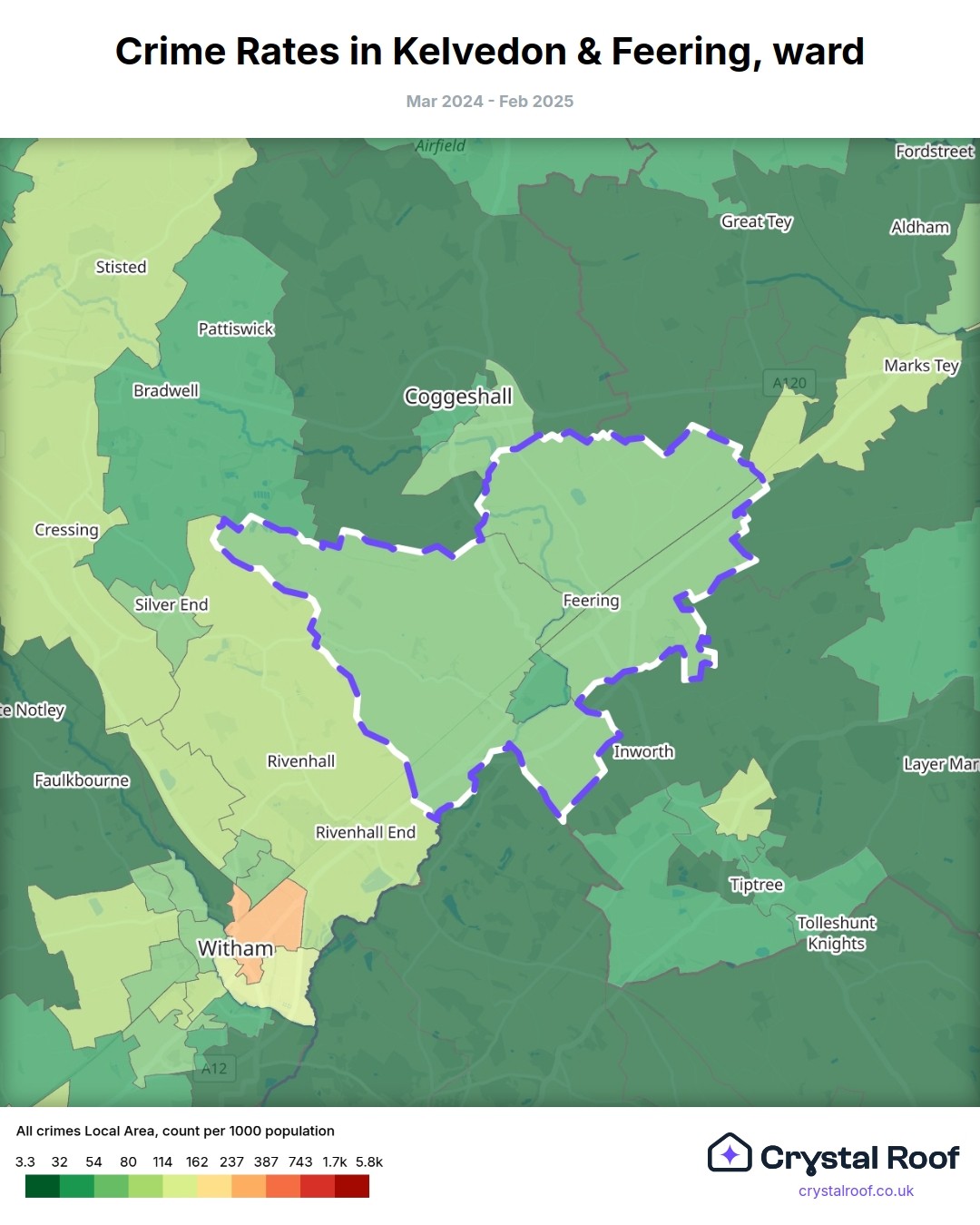 Kelvedon & Feering, (ward) includes areas with the following crime ratings (see map):