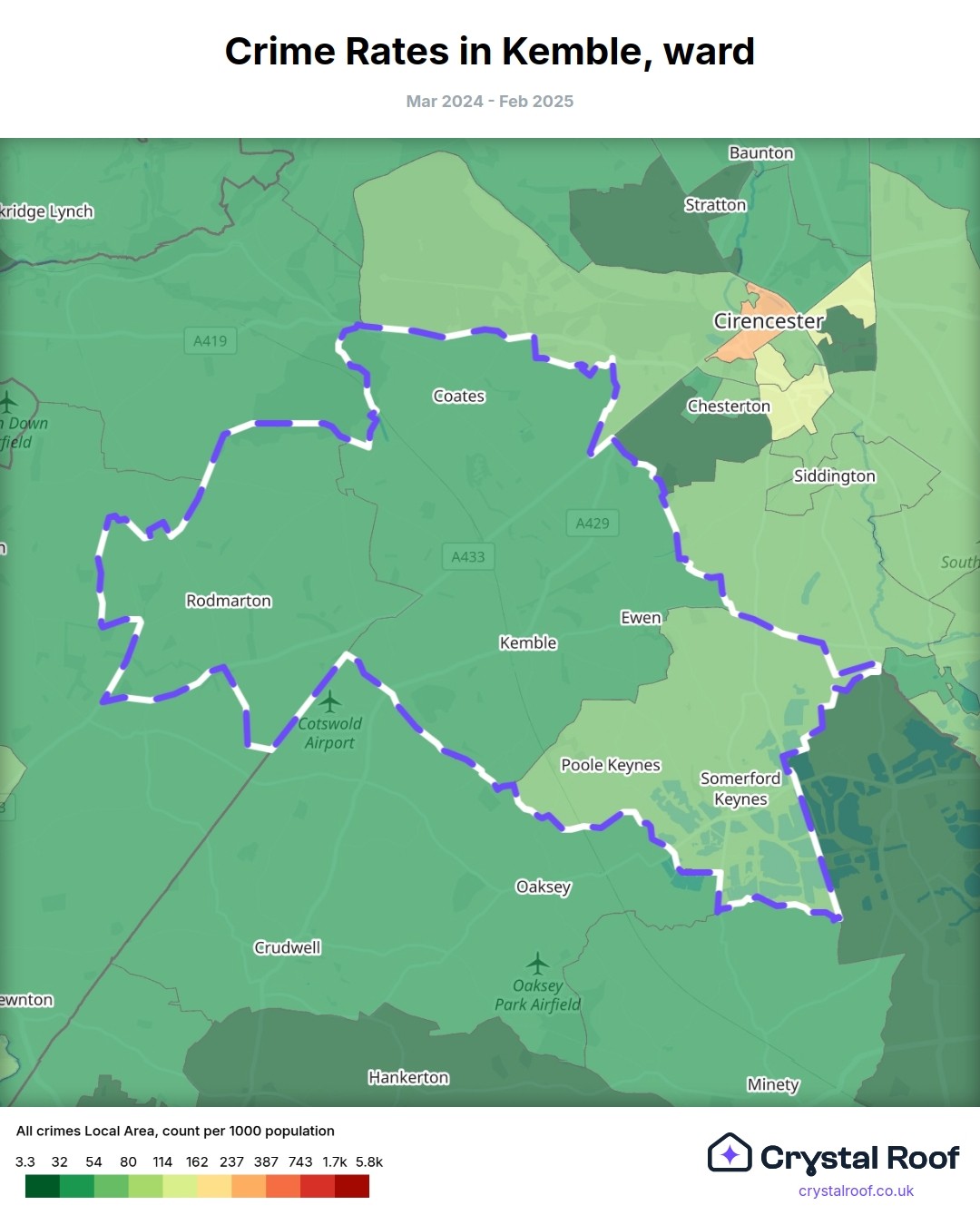 Kemble, (ward) includes areas with the following crime ratings (see map):