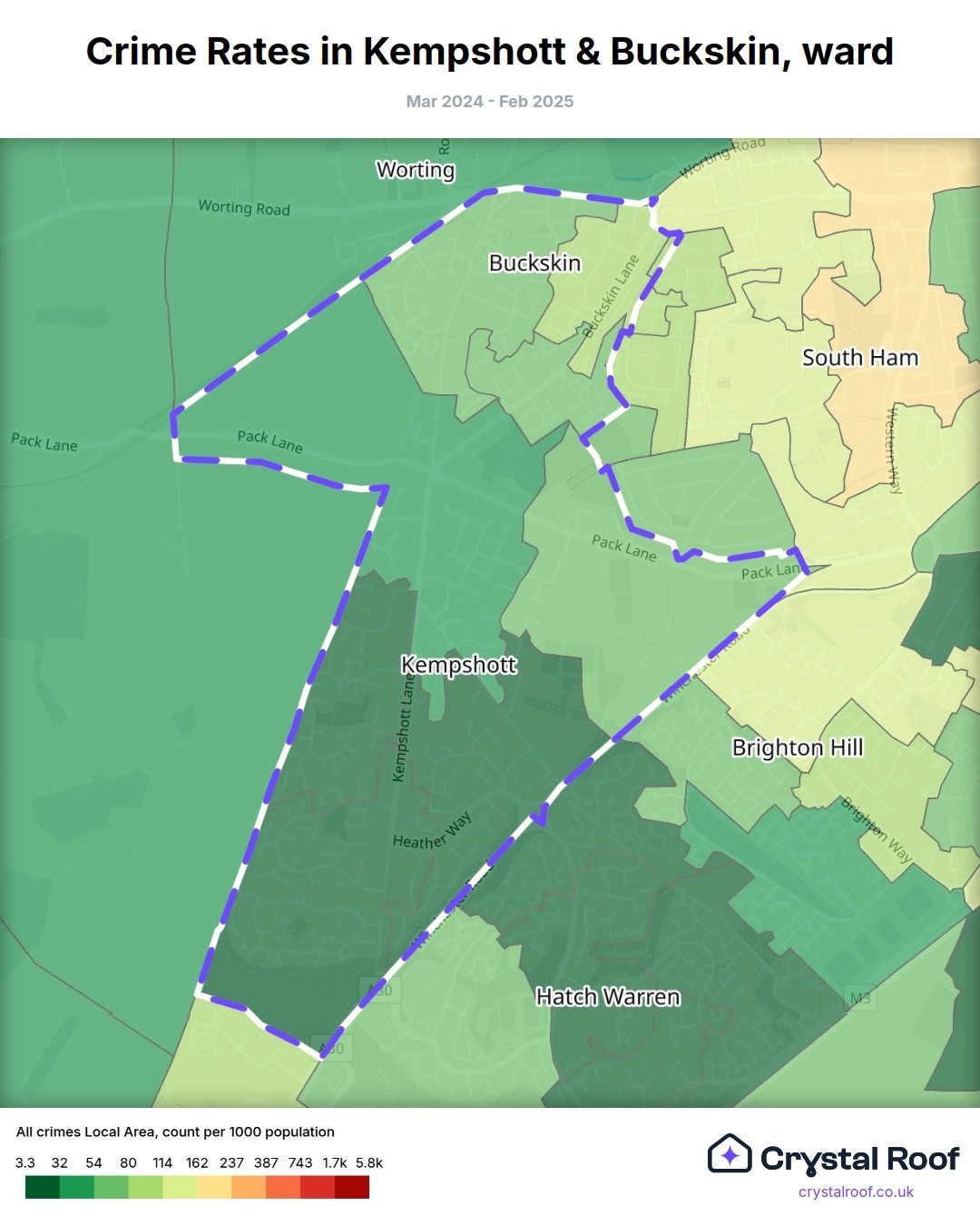 Kempshott & Buckskin, (ward) includes areas with the following crime ratings (see map):