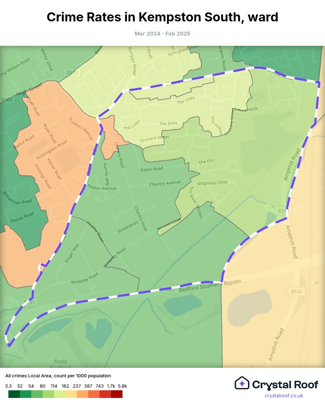 Kempston South, (ward) includes areas with the following crime ratings (see map):