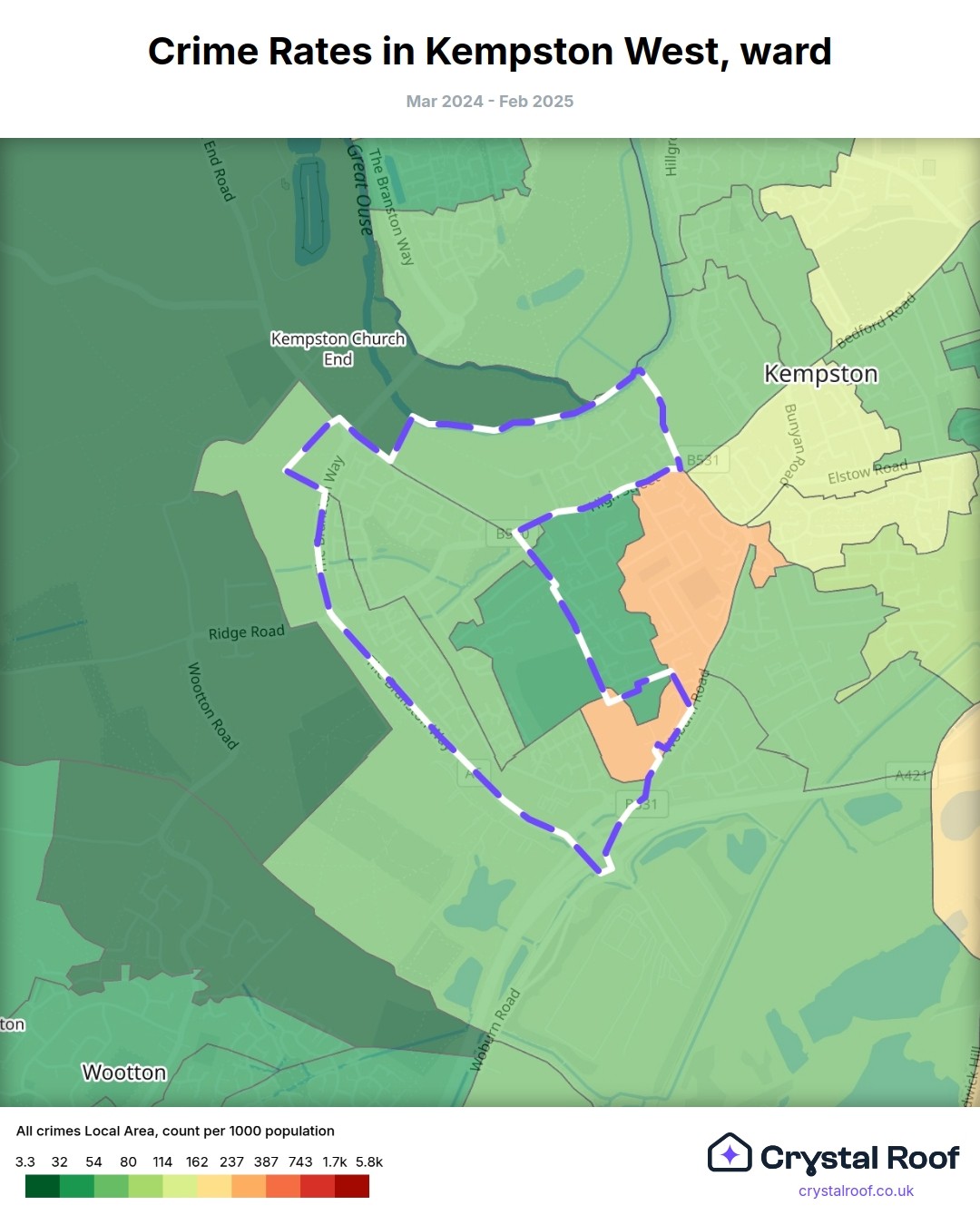Kempston West, (ward) includes areas with the following crime ratings (see map):
