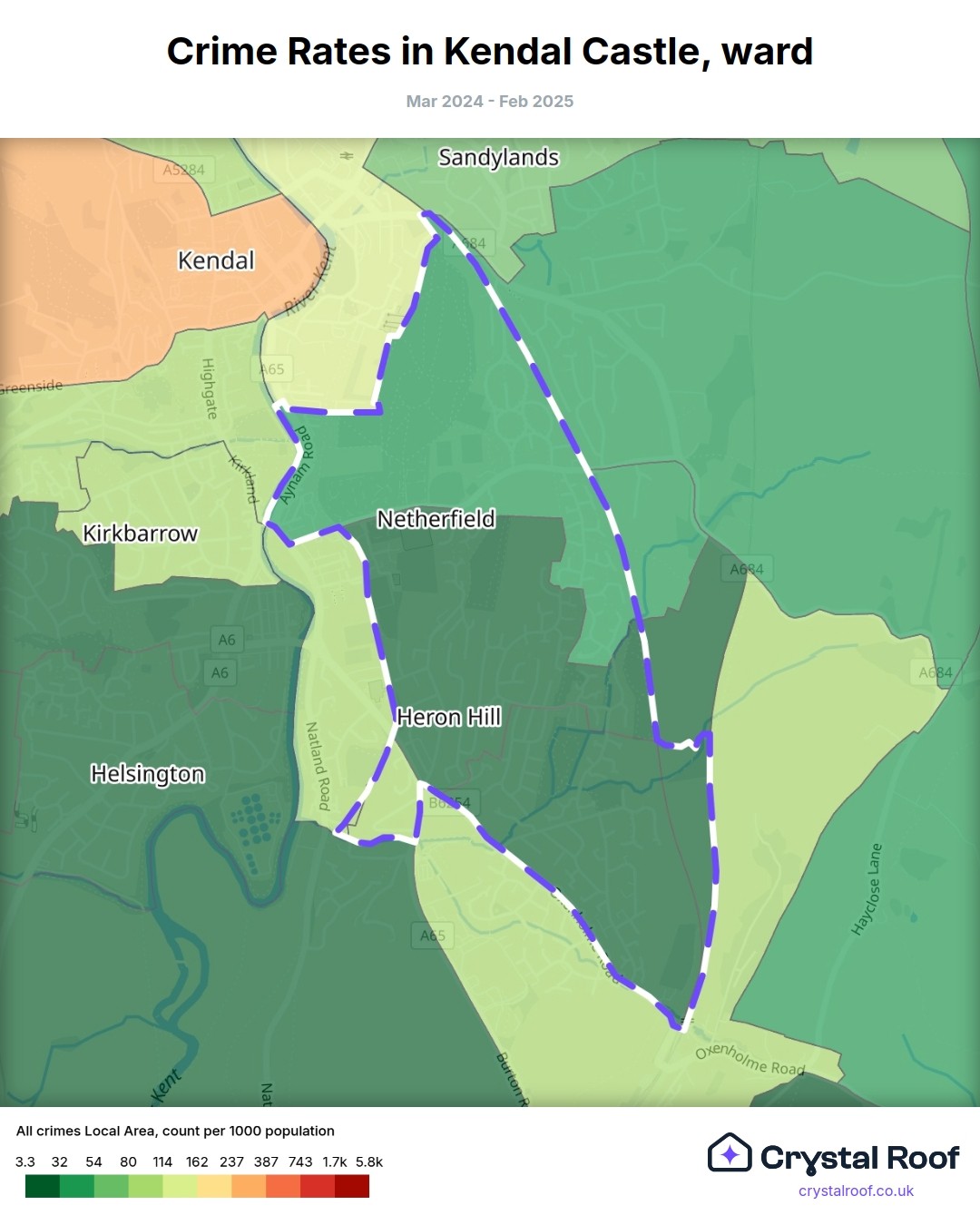 Kendal Castle, (ward) includes areas with the following crime ratings (see map):
