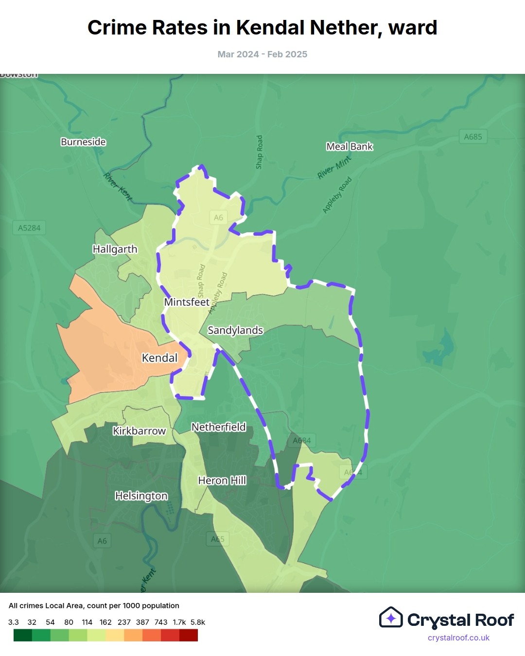 Kendal Nether, (ward) includes areas with the following crime ratings (see map):
