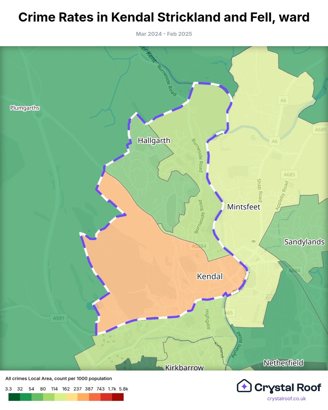 Kendal Strickland and Fell, (ward) includes areas with the following crime ratings (see map):