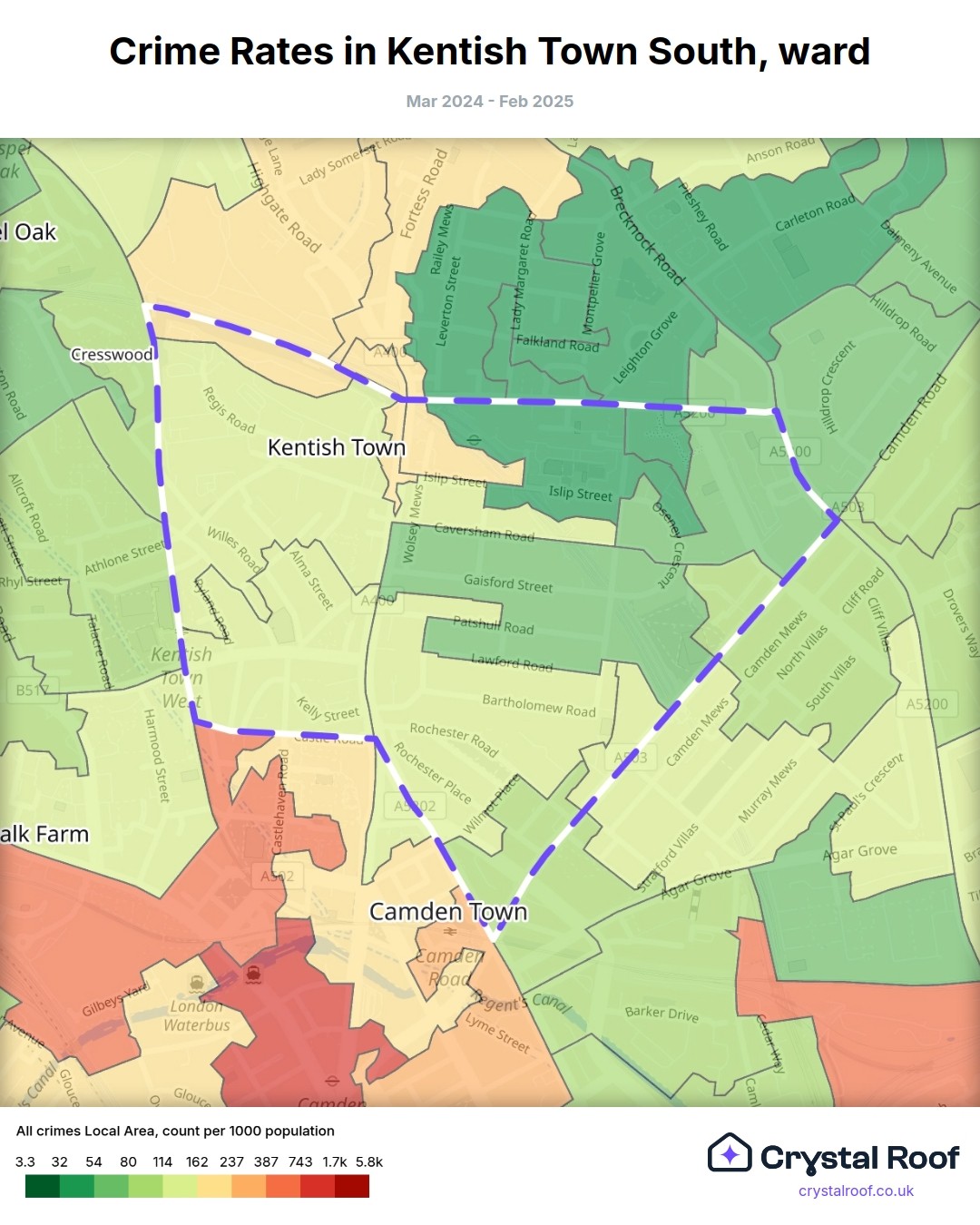 Kentish Town South, (ward) includes areas with the following crime ratings (see map):