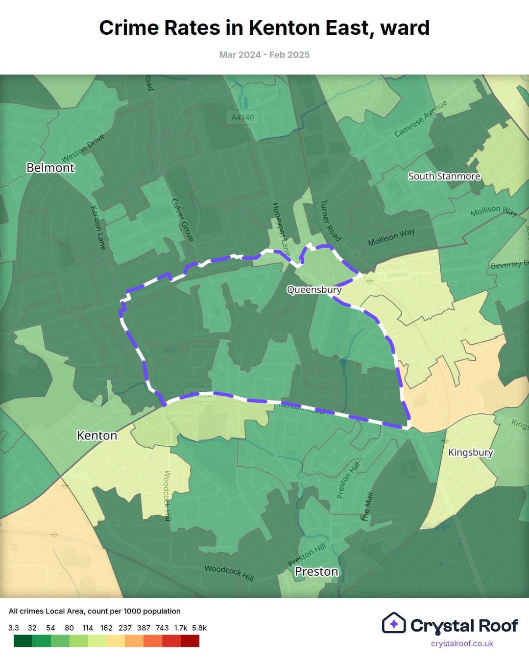 The figures in grey indicate the relative ratings of Kenton East (ward) for a specific crime type compared to other wards in England and Wales.