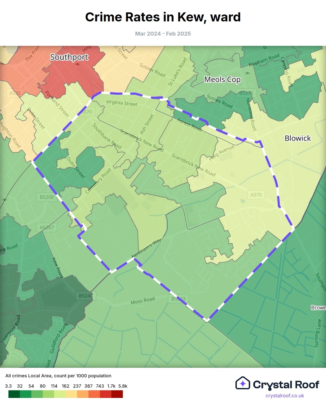 Kew (ward) is located within Sefton (borough). Annual total crime rate in Sefton (borough) is 86.3 crimes per thousand resident population, which can be rated as 4 out of 10 or low crime level compared to other local authority districts in England and Wales.