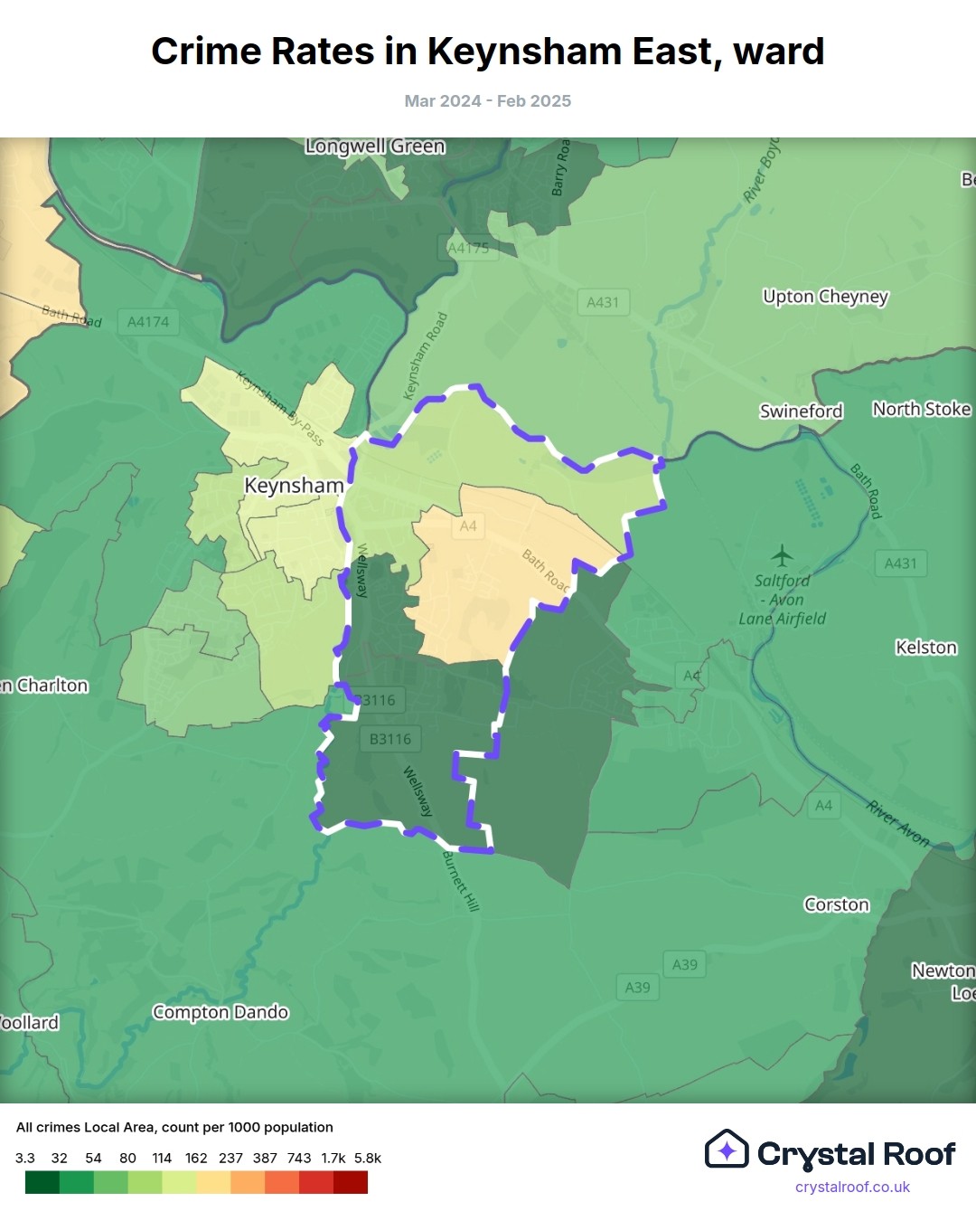 The figures in grey indicate the relative ratings of Keynsham East (ward) for a specific crime type compared to other wards in England and Wales.