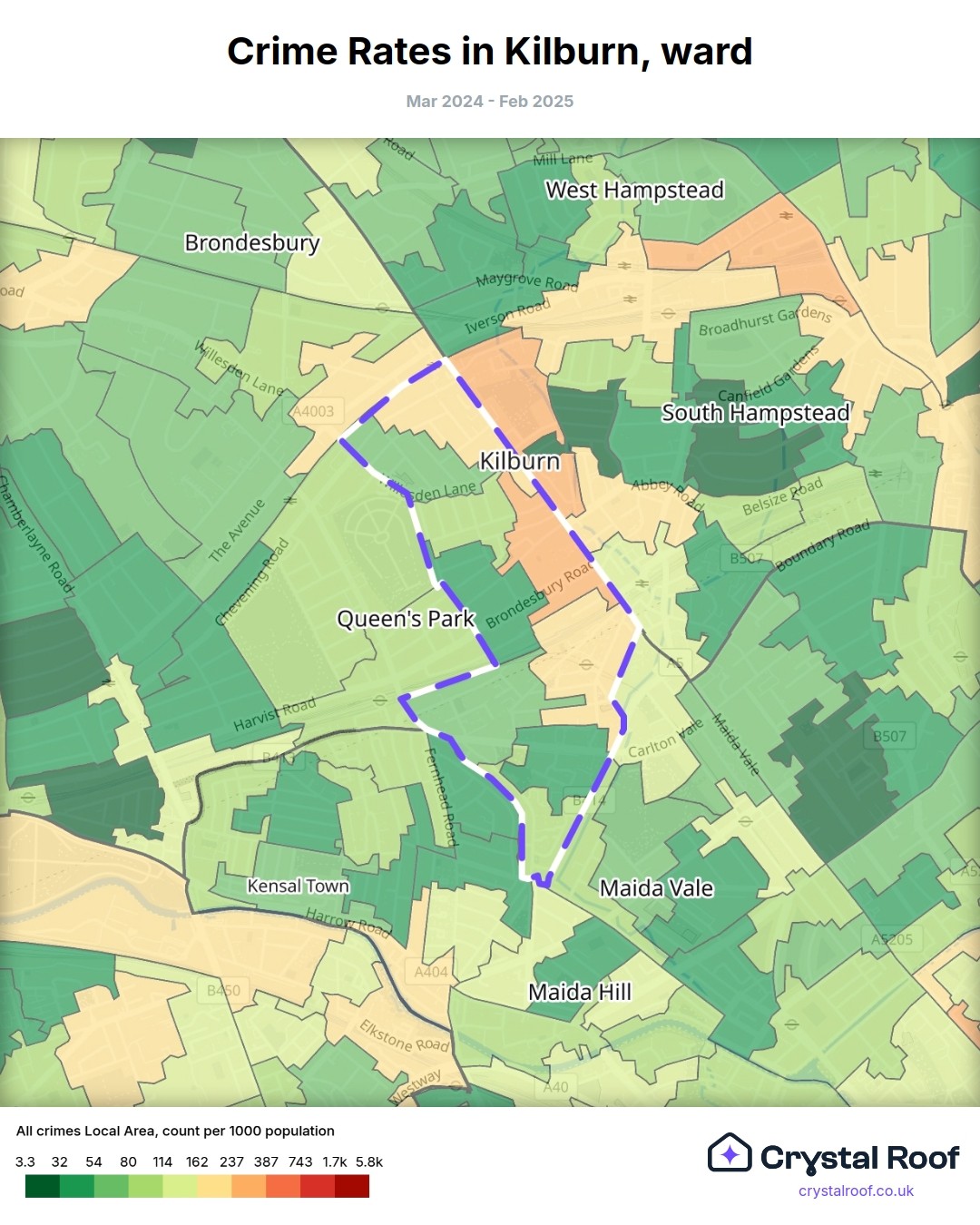 Kilburn, (ward) includes areas with the following crime ratings (see map):