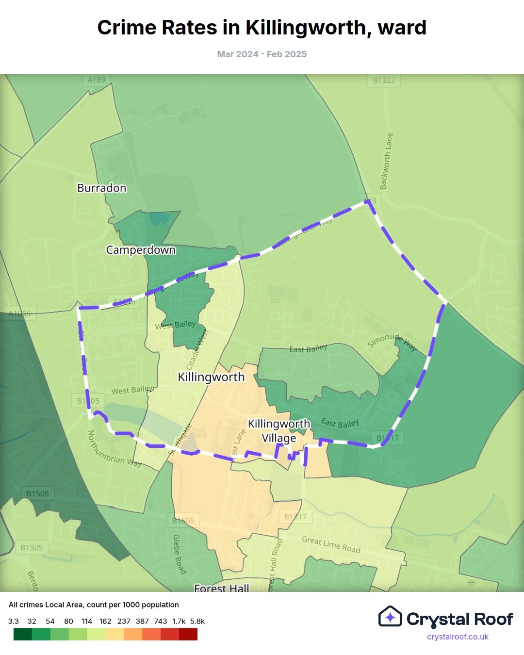 Killingworth, (ward) includes areas with the following crime ratings (see map):