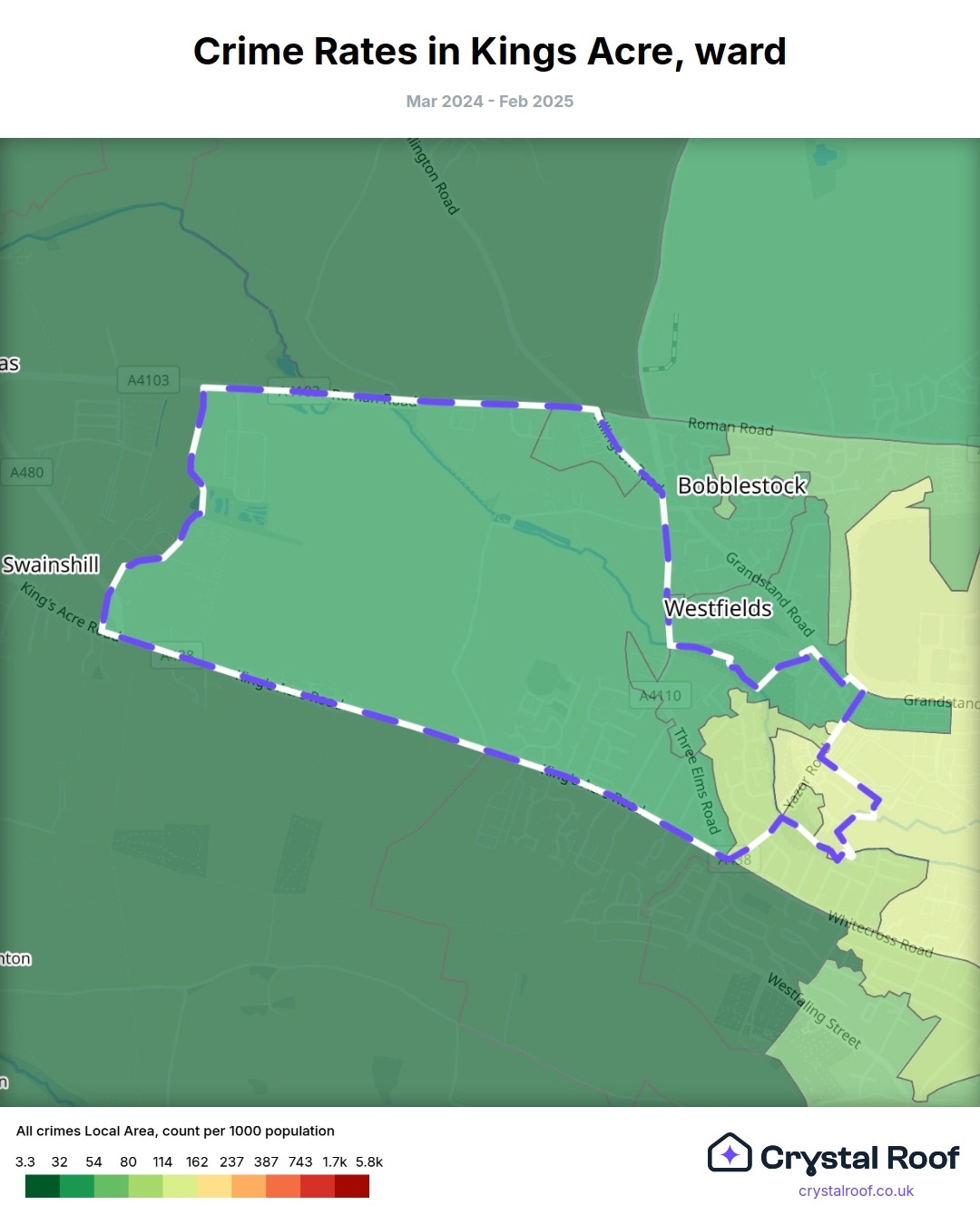 The figures in grey indicate the relative ratings of Kings Acre (ward) for a specific crime type compared to other wards in England and Wales.